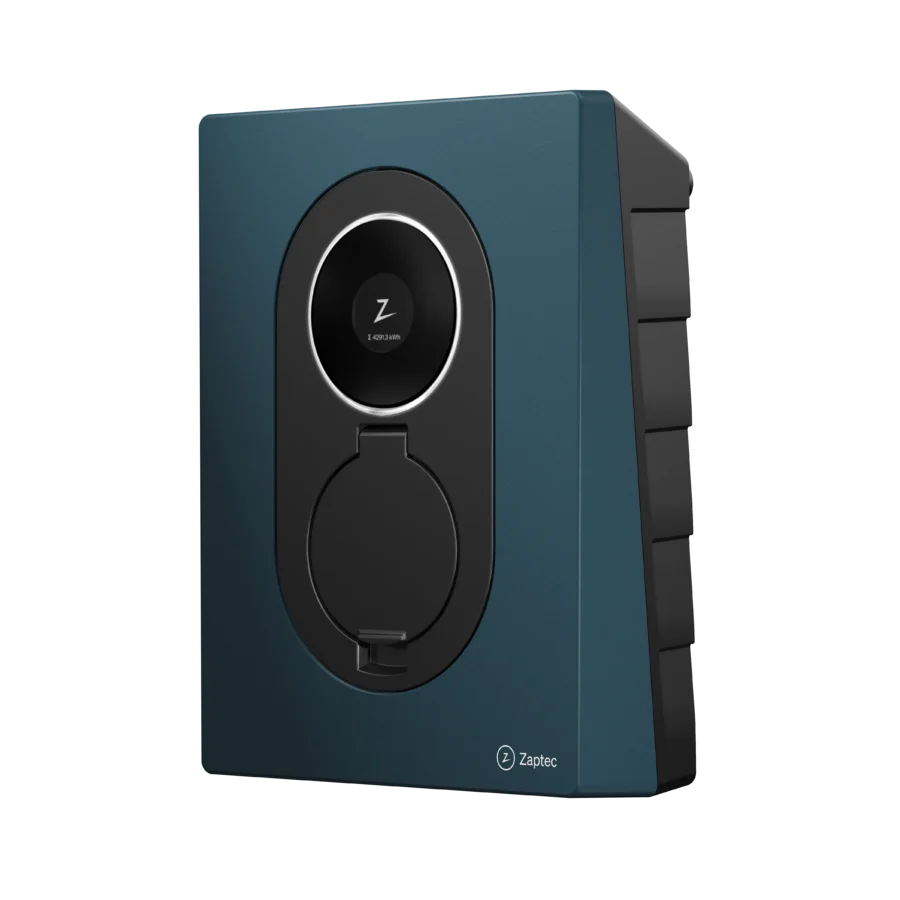Svart Zaptec Go-elbillader montert på garasjevegg